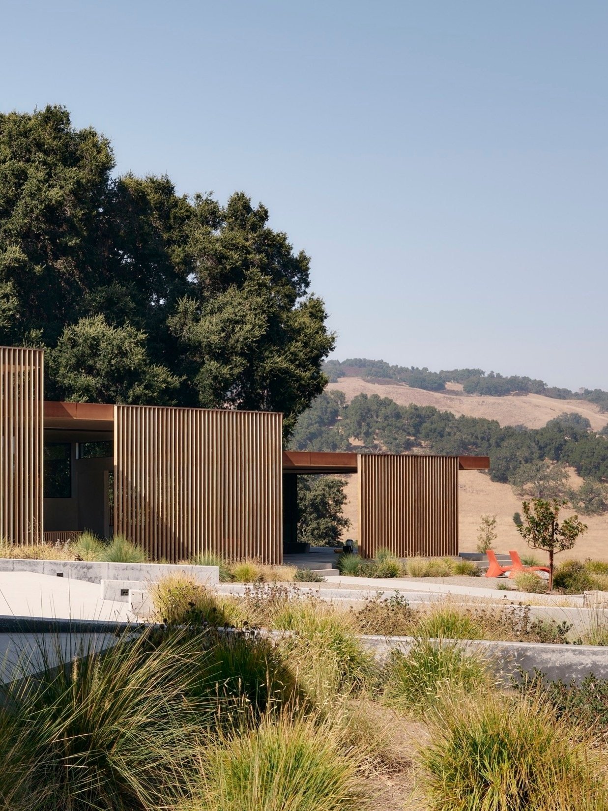 The integrated design of the architecture and landscape was shaped by the client’s appreciation for modern design and keen attention to its oak woodlands context. A minimalist landscape palette complements the strong lines of the house while linking it to the surrounding forested hills. Sustainability drove the approach to water management through the use of drought-tolerant plants; hydrozoned irrigation; the introduction of fruit trees for shade; and the installation of dissipation basins, which slow runoff and return water to the ground.