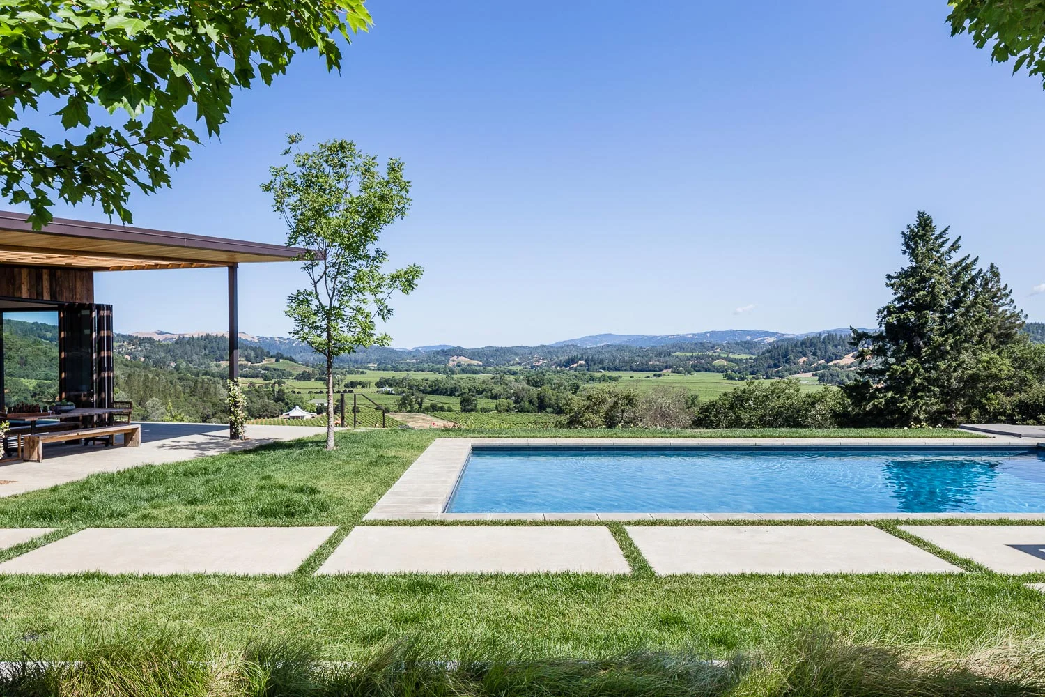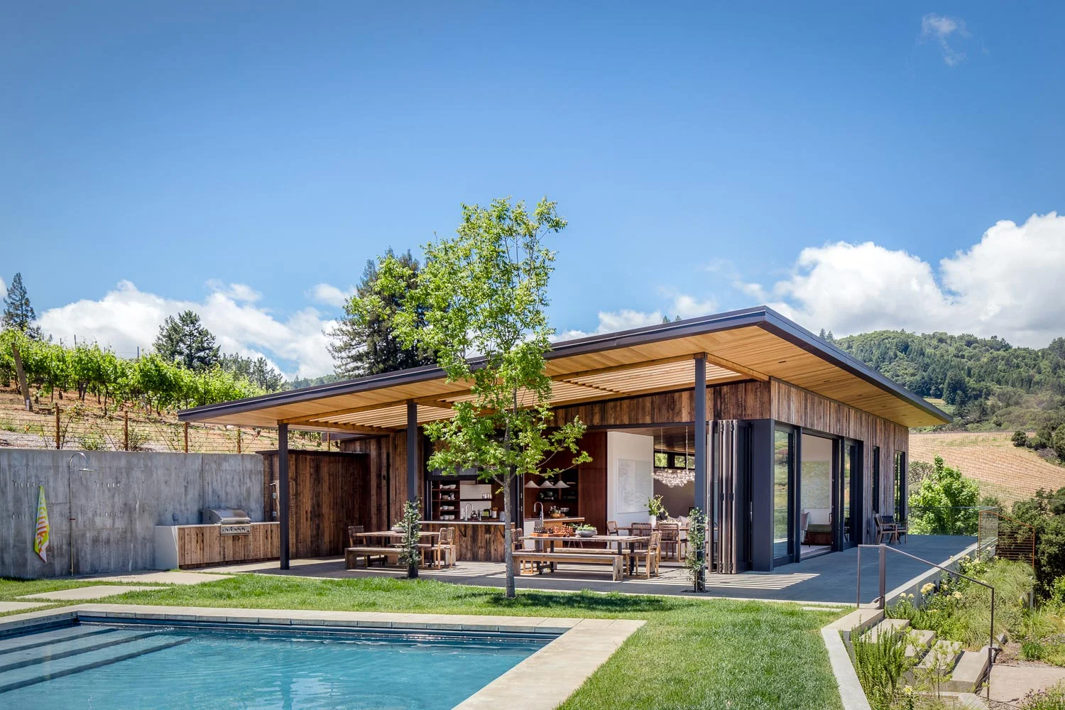 The house was designed as an open-air pavilion to embrace the sweeping views. Metal and glass panels lift to provide seamless connections to the landscape. To the north, the dark plastered pool reflects the sky. To the south, the fire pit patio sits above the sparkling lights of Healdsburg.