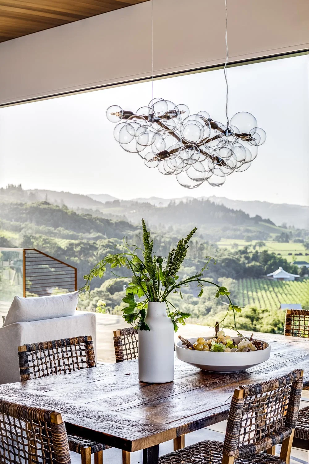 A rustic wood table holds elegant vases. under a dramatic light fixture, with hills and vineyards in the distance.