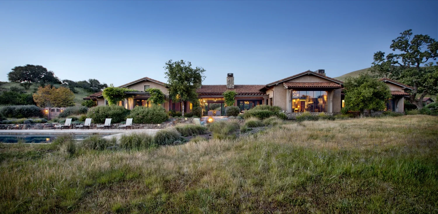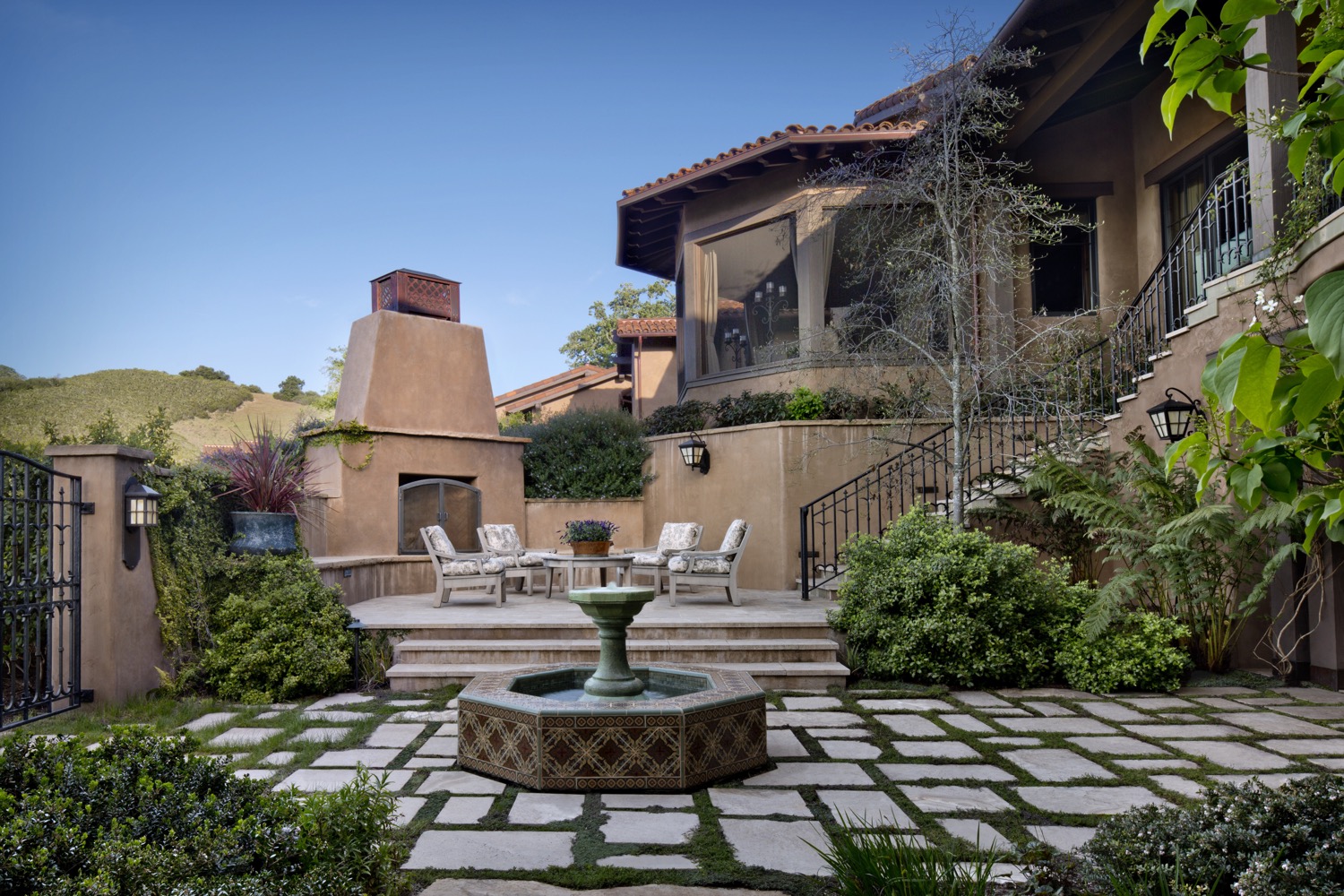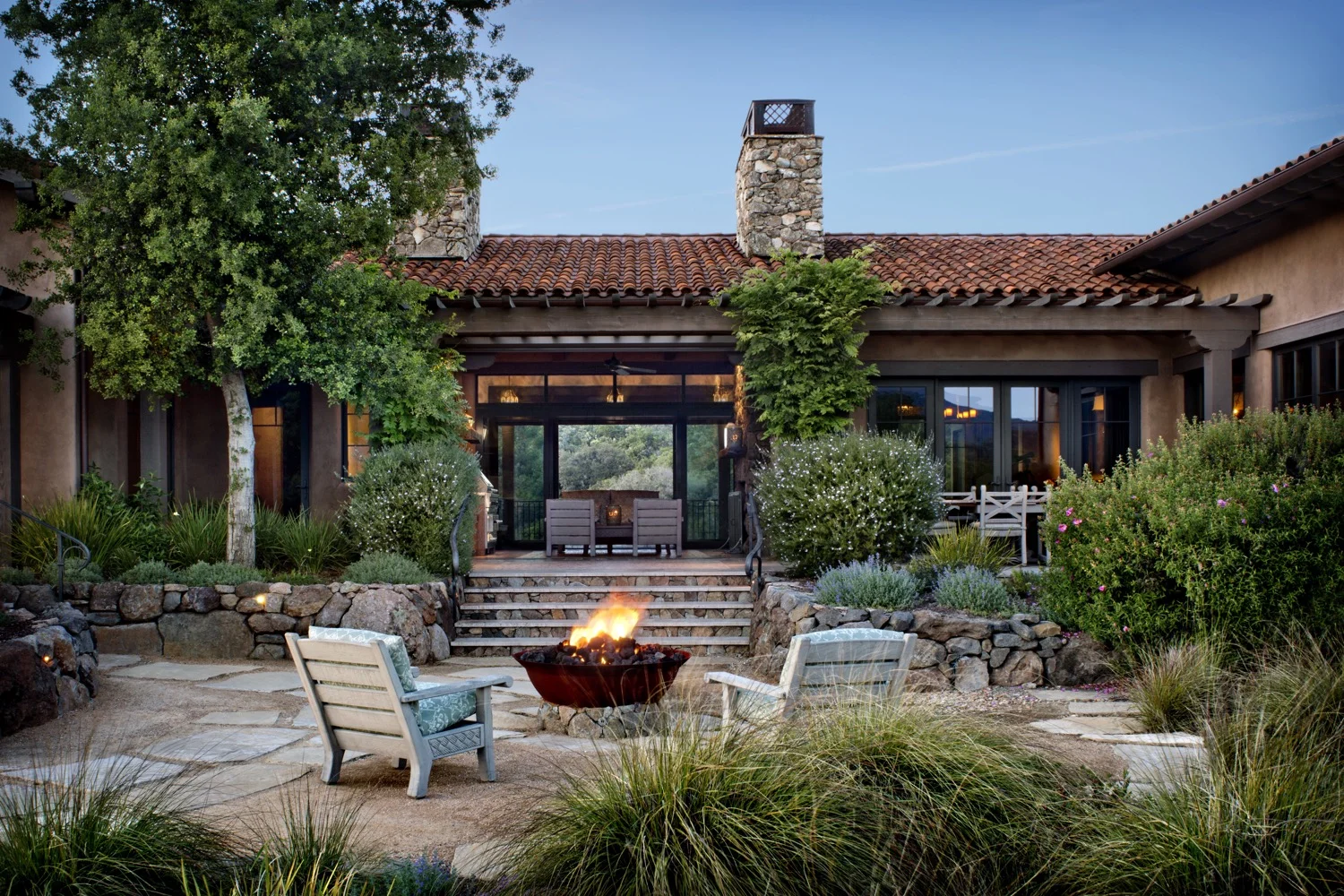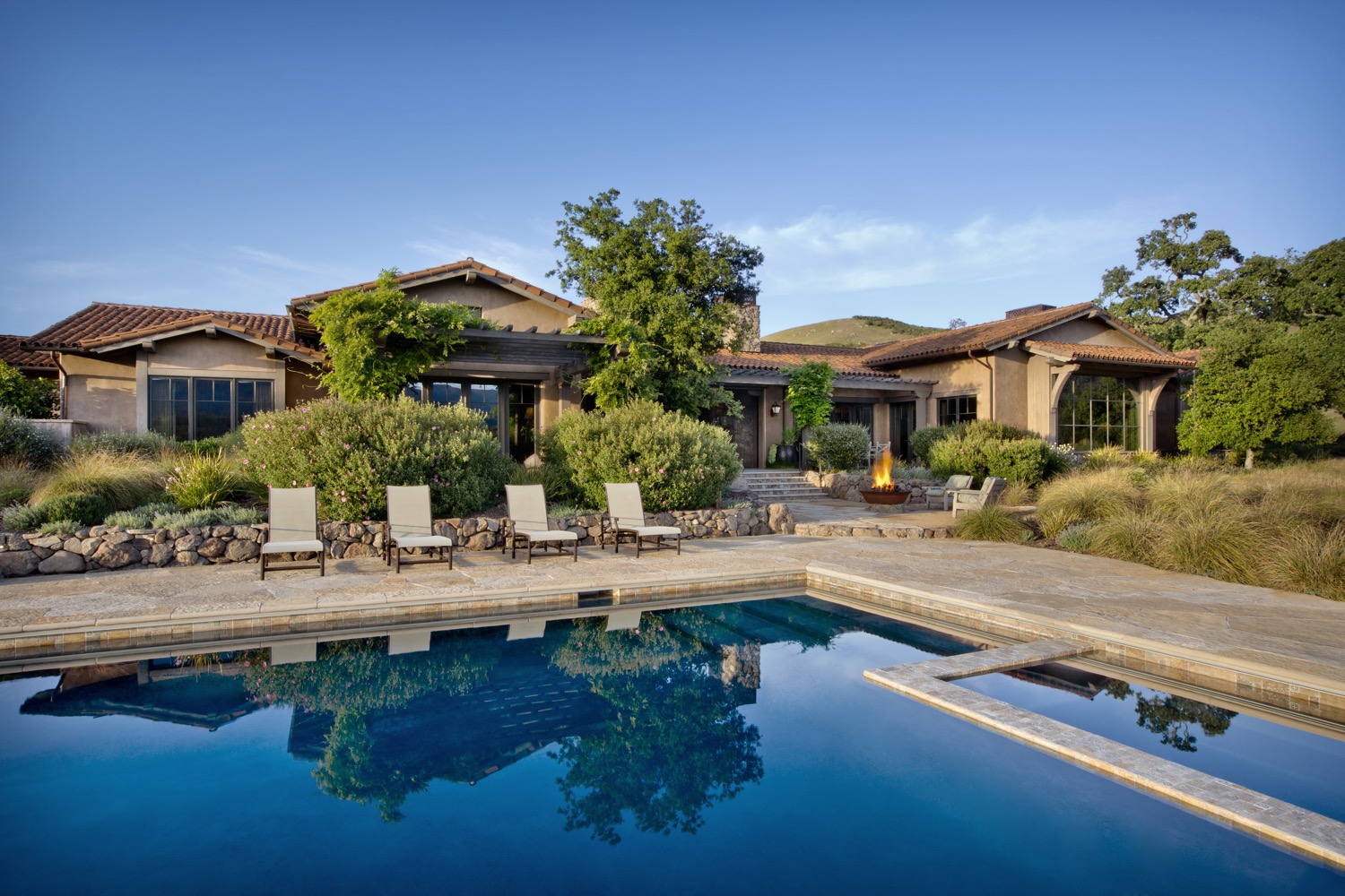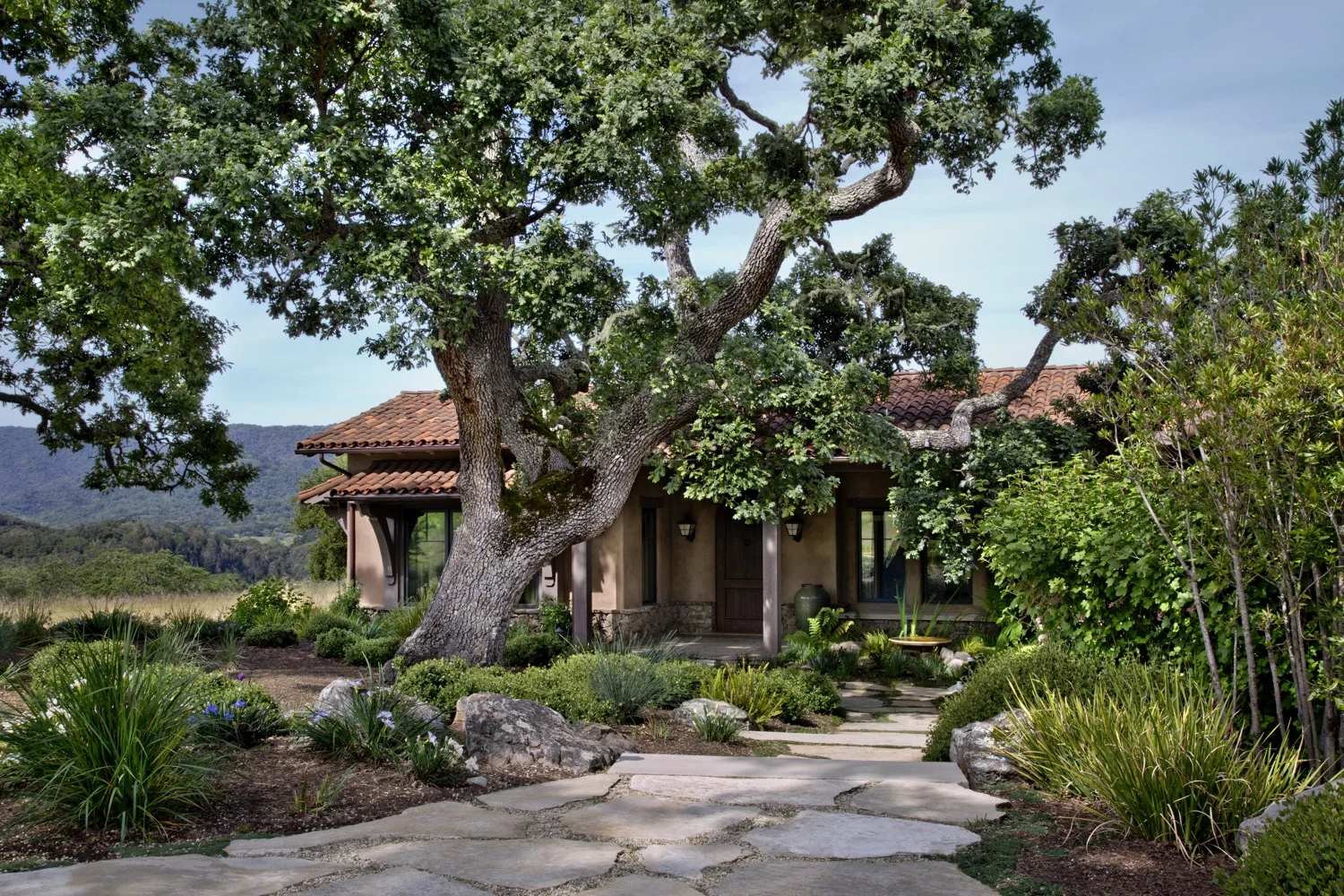 A beautiful site with wide open 360° views and three landmark valley oaks brought a wonderful family with energetic grandchildren to the Santa Lucia Preserve. We aimed to create a landscape that was responsive to the scale with the openness of the space, but remained as light on the land as possible, while providing lots of places for play and peace. The firepit anchors a quiet gathering place, within earshot of the pool. We connected the pool with the natural setting by limiting the extent of pool decking. The stone, pool tile and decomposed granite reflect the natural setting: the buff colors of grasses, lichen-covered stones and blue skies. Courtyards provide sheltered outdoor spaces within the expansive grassland, as well as shade and a place to relax out of the elements.